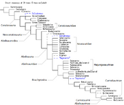 | 21:02, 17 gru 2013 | Pol i Rauhut 2012.GIF (plik) | 4 KB | Kladogram z Pol i Rauhut, 2012 - ścisły konsensus po usunięciu ''Genusaurus'' (grupujący się z Noasauridae lub ''Carnotaurus''+''Aucasaurus'') oraz ''Kryptops'' (abelizauryd bardziej zaawansowany niż ''Eoabelisaurus'', lecz | 1 | |