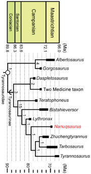 | 17:14, 22 mar 2014 | Fiorillo i Tykoski 2014 Nanuqsaurus Loewen.png (plik) | 53 KB | Skalibrowany stratygraficznie kladogram z Fiorillo i Tykoski 2014 (na podstawie Loewen i in., 2013 z dodanym ''Nanuqsaurus''), uproszczony. Fiorillo, A.R. & Tykoski, R.S. (2014) "A Diminutive New Tyrannosaur from the Top of the World" PLoS ONE, 9(3), | 1 | |