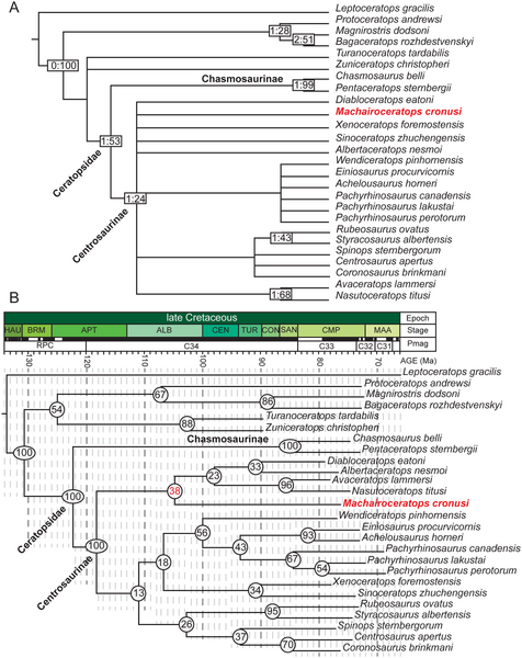 Źródło: Lund, E., K., O’Connor, P., M., Loewen, M., A., Jinnah, Z., A. (2016). "A New Centrosaurine Ceratopsid, Machairoceratops cronusi gen et sp. nov., from the Upper Sand Member of the Wahweap Formation (Middle Campanian), Southern Utah". PLoS ONE. 11 (5): e0154403. doi:10.1371/journal.pone.0154403