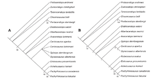 Wersja z dnia 20:30, 14 lip 2024 autorstwa Paweł (dyskusja | edycje) (Kladogram z publikacji opisującej ''Spinops''. Źródło: Farke, A. A., M. J. Ryan, P. M. Barrett, D. H. Tanke, D. R. Braman, M. A. Loewen, and M. R. Graham. 2011. ''A new centrosaurine from the Late Cretaceous of Alberta, Canada, and the evoluti...)