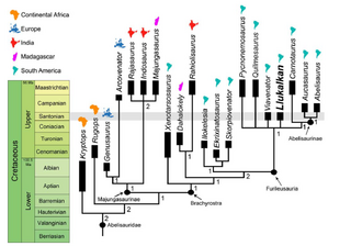 Kladogram z Gianechini i in., 2021. Gianechini, F.A., Méndez, A.H., Filippi, L.S., Paulina-Carabajal, A., Juárez-Valieri, R.D. & Garrido, A.C. (2021). "A New Furileusaurian Abelisaurid from La Invernada (Upper Cretaceous, Santonian, Bajo De La Carpa Formation), Northern Patagonia, Argentina". Journal of Vertebrate Paleontology: e1877151. doi:10.1080/02724634.2020.1877151