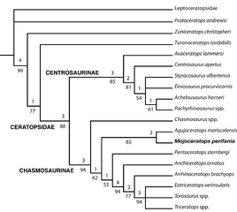 Wersja z dnia 18:35, 30 paź 2024 autorstwa Paweł (dyskusja | edycje) (Kladogram z Longrich, 2010 Longrich, N. R. (2010). "''Mojoceratops perifania'', a new chasmosaurine ceratopsid from the late Campanian of western Canada". Journal of Paleontology, 84(4), 681-694. doi:10.1666/09-114.1 )