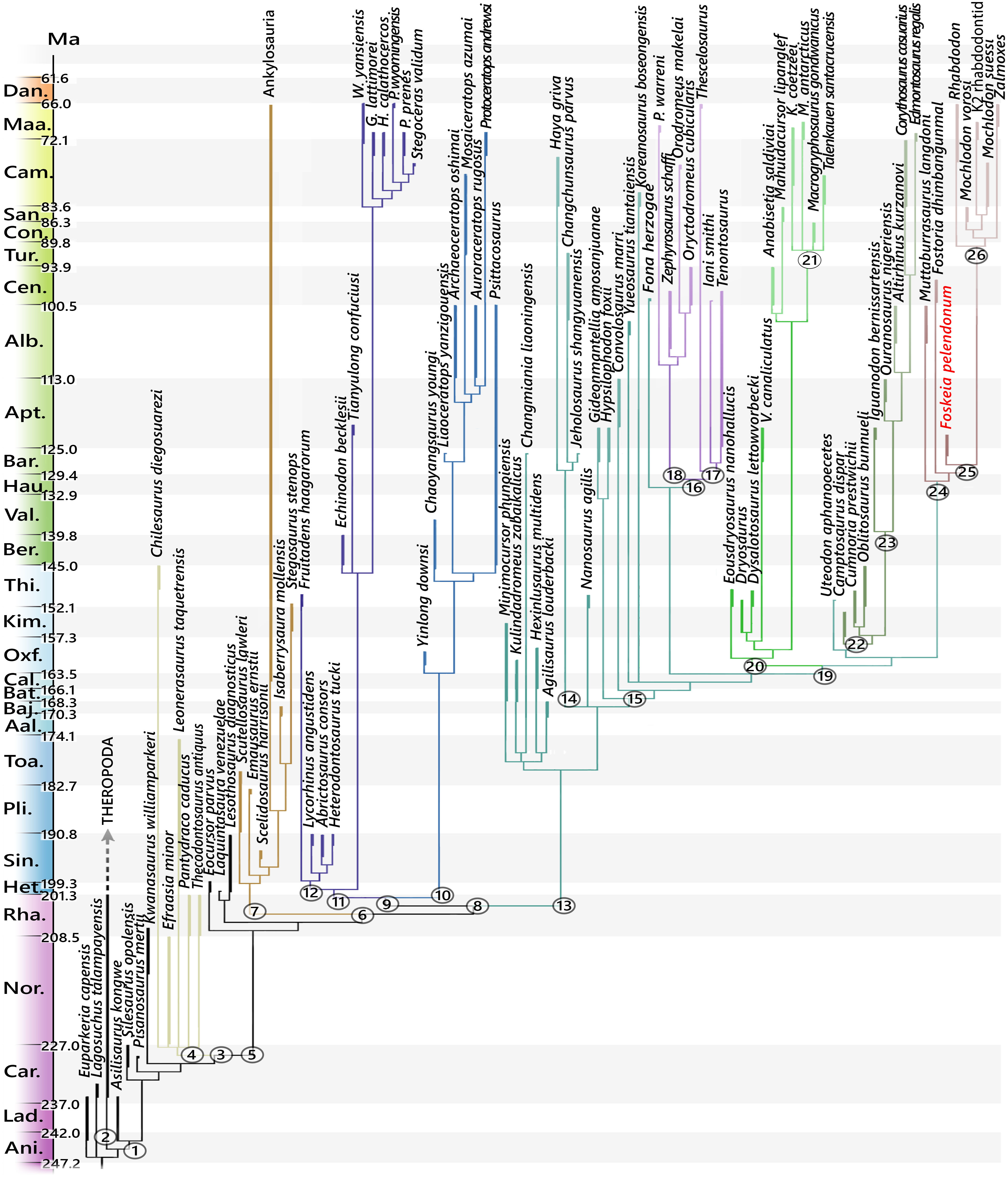 Kladogram z Dieudonne i in., 2026. Dieudonne, P.-M., Becerra, M.G., Zanesco, T., Tortosa, T., Cruzado-Caballero, P., Stein, K. & Fernandez-Baldor, F.T. (2026). „Foskeia pelendonum, a new rhabdodontomorph from the Lower Cretaceous of Salas de los Infantes (Burgos Province, Spain), and a new phylogeny of ornithischian dinosaurs.” Papers in Palaeontology, Vol. 12, Part 1, e70057.