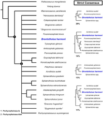 Kladogram z Woodruff i in., 2025 - ścisły konsensus. Woodruff, D.C.; Horner, J.R.; Goodwin, M.B. & Evans, D.C. (2025). "The first pachycephalosaurid from the Late Cretaceous Two Medicine Formation: effects of the Western Interior Seaway on North American pachycephalosaurid evolution". Zoological Journal of the Linnean Society. 205 (2) zlaf087. doi:10.1093/zoolinnean/zlaf087