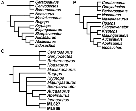 Kladogramy z Hendrickx i Mateus, 2014 (na podstawie Xu i in., 2009; Brusatte i in., 2010; Martinez i in., 2011; Senter 2011; Pol i Rauhut 2012; Carrano i in., 2012 z dodanymi 141 cechami zębów). A - macierz analizowana z Erectopus i Piatnitzkysaurus, B - macierz bez tych taksonów, C - macierz z dodanymi zębami z późnej jury Portugalii - ML 327 i ML 966 (w A i C Ceratosauridae tworzyły politomię z Abelisauroidea i Tetanurae).