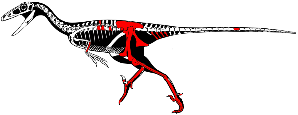 Rekonstrukcja szkieletu zaawansowanego troodontyda Talos, na czerwono odnaleziony materiał uzupełniony na podstawie Troodon i Saurornithoides. Autor: Scott Hartman, z Zanno i in., 2011.