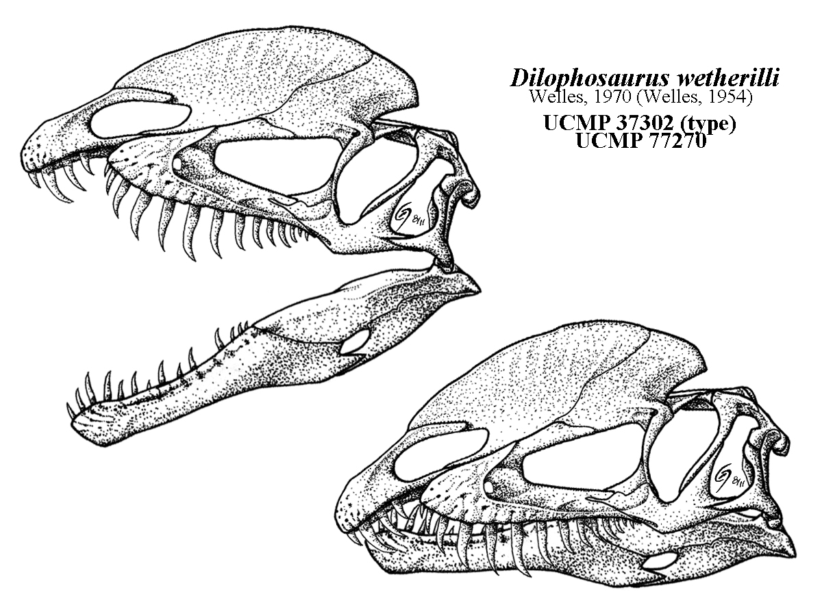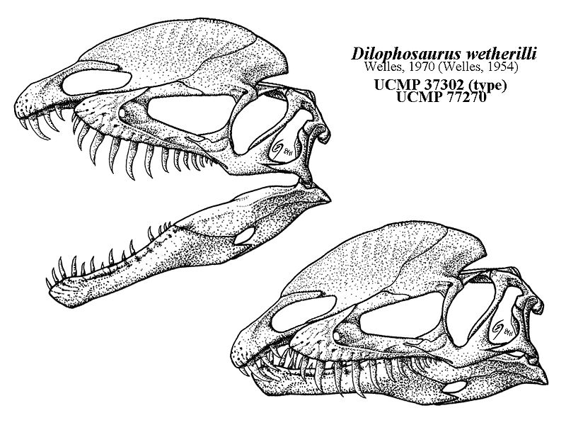 Czaszka Dilophosaurus wetherilli, na podstawie UCMP 37302 i UCMP 77270.