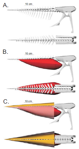 Model ogona Ajancingenia w widokach z boku i z góry: model szkieletowy (A), z dodanym M. caudofemoralis (B) i dodanymi M. spinalis/M. longissimus (złoty kolor) i M. ilio-ischiocaudalis (różowy kolor) (C).