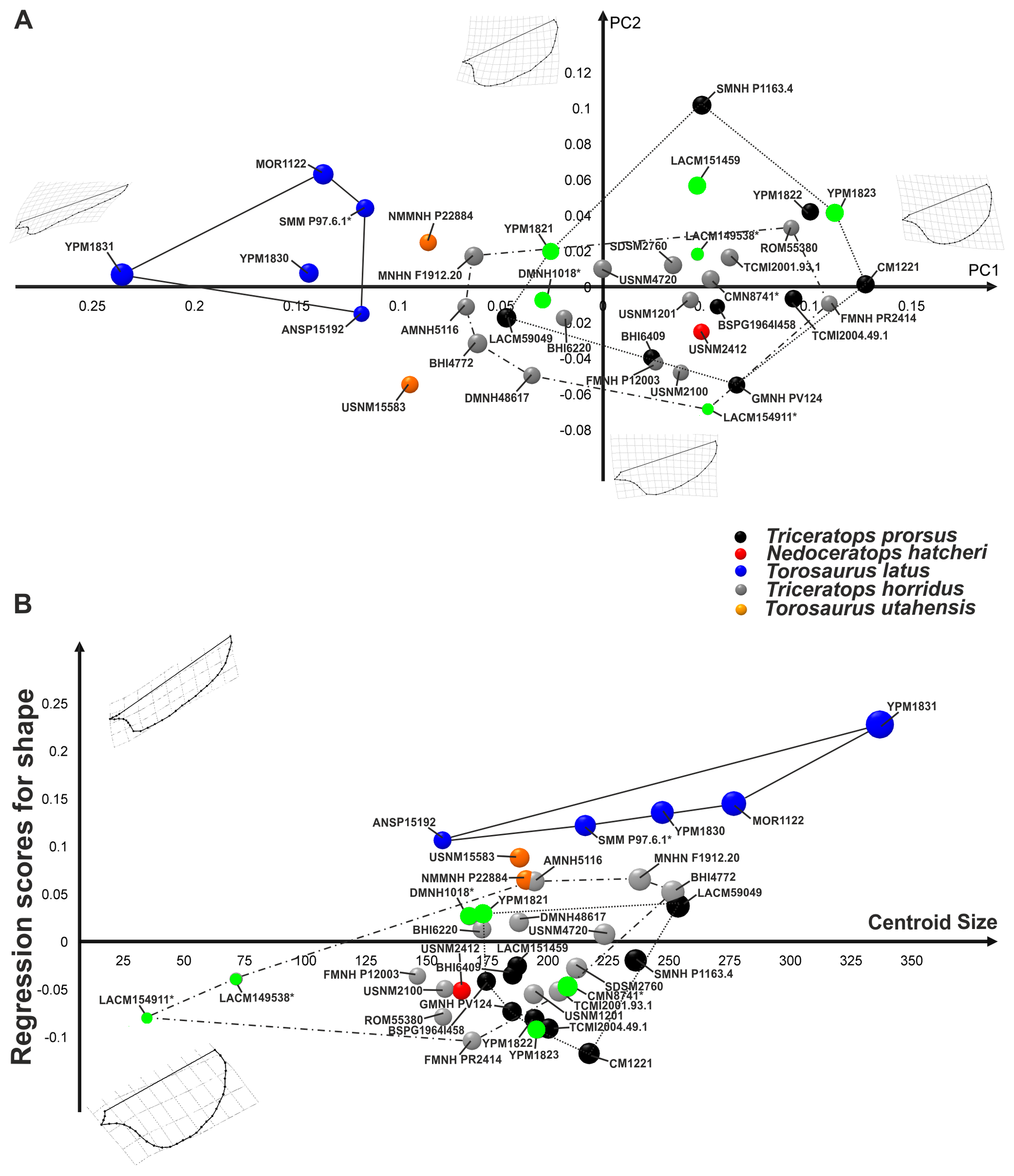 Wyniki analiz morfometrycznych Maiorino i in. (2013) (analiza głównych składowych [PCA] - kość łuskowa. A: relacje między PC1 i PC2. B: zmiany morfologii w powiązaniu z rozmiarami (reprezentowanymi przez rozmiar centroida, rozmiar punktów proporcjonalny do rozmiarów centroida). Zmodyfikowano z Maiorino i in. (2013): dodano zielony kolor punktów na oznaczenia Triceratops o niepewnej identyfikacji (zob. opis Triceratops).