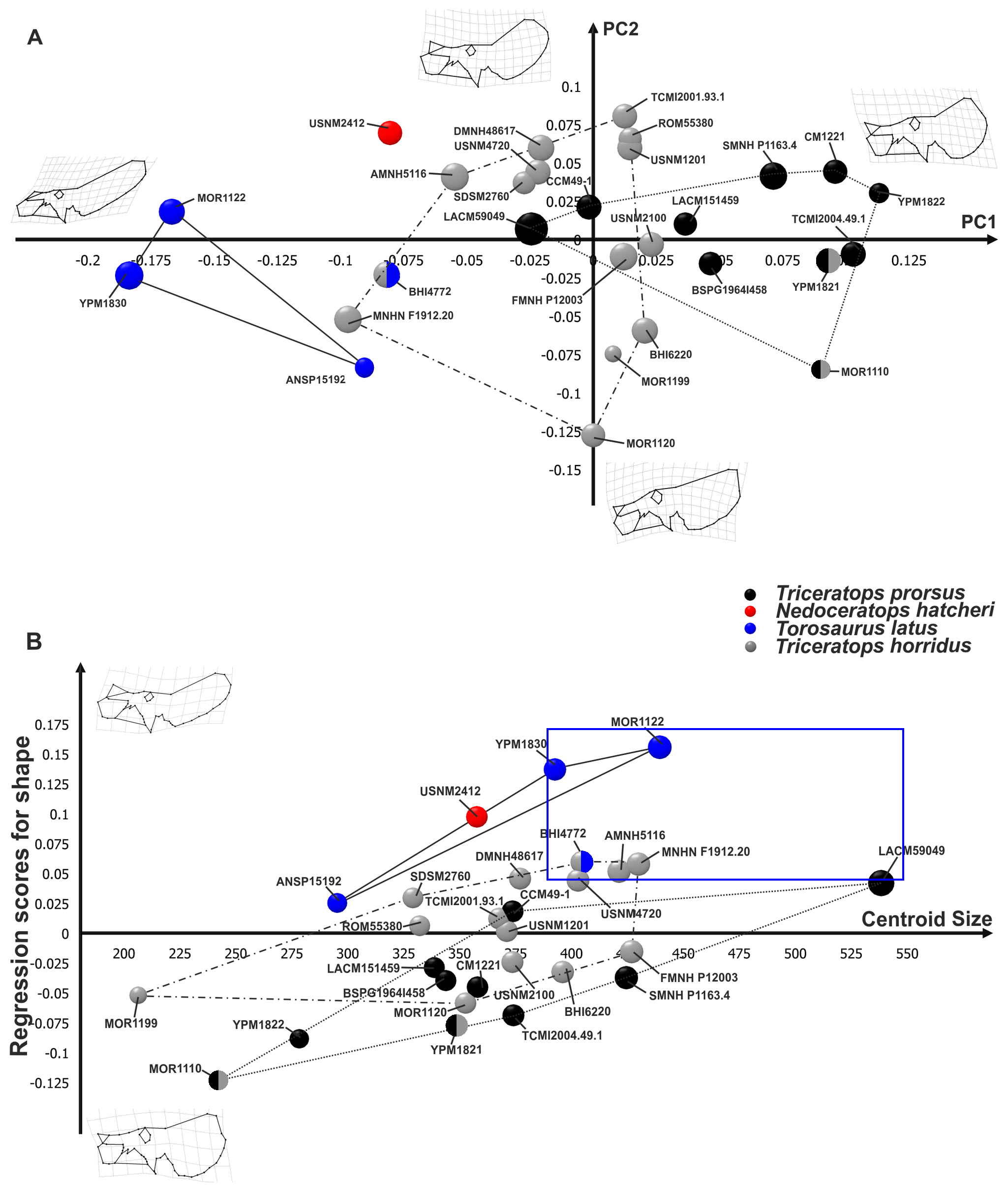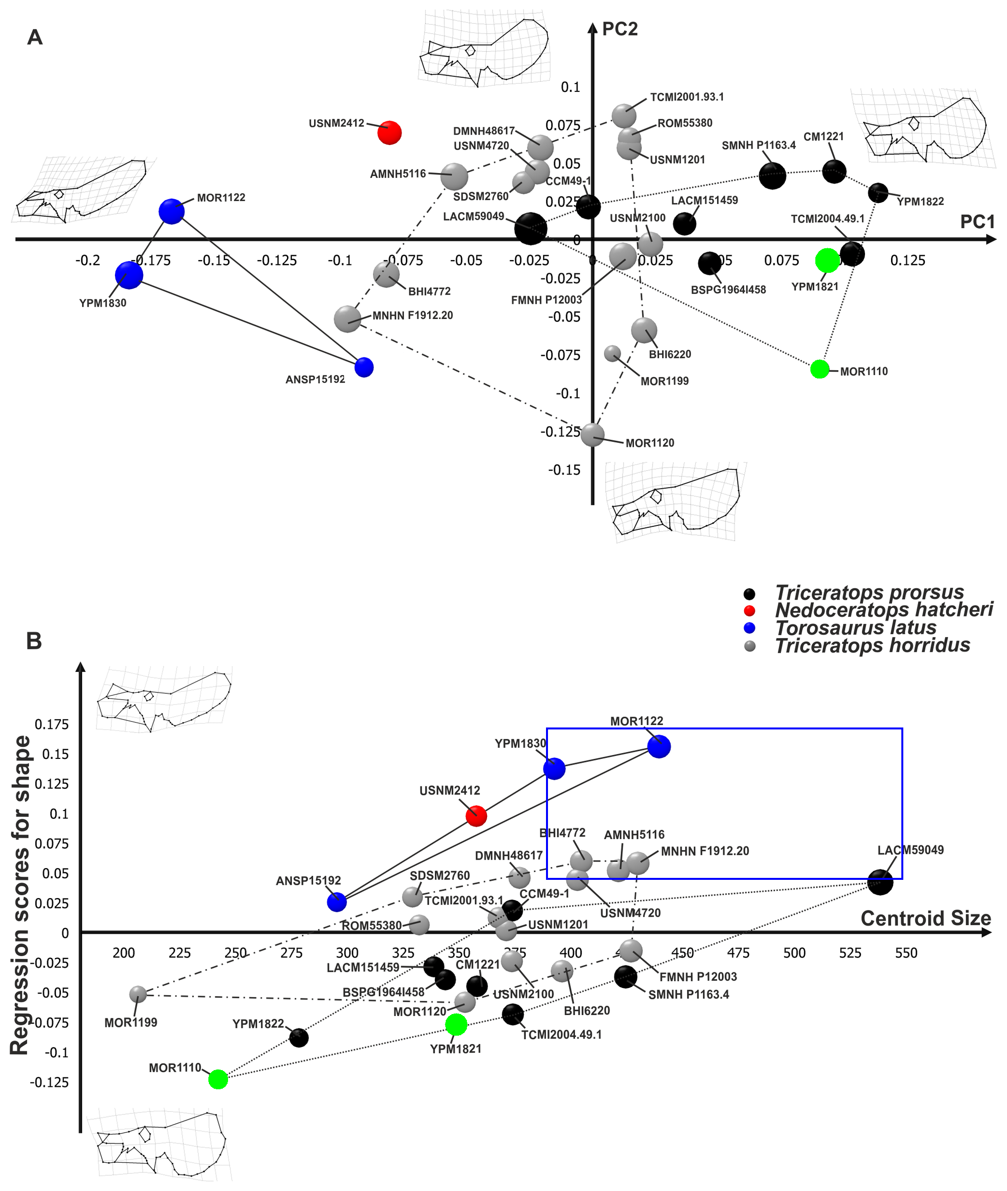 Wyniki analiz morfometrycznych Maiorino i in. (2013) (analiza głównych składowych [PCA] - cała czaszka,. A: relacje między PC1 i PC2. B: zmiany morfologii w powiązaniu z rozmiarami (reprezentowanymi przez rozmiar centroida, rozmiar punktów proporcjonalny do rozmiarów centroida). Kolory punktów: niebieski: Torosaurus, szary: Triceratops horridus, czarny: Triceratops prorsus, zielony: Triceratops o niepewnej identyfikacji (zob. opis Triceratops), pomarańczowy - Nedoceratops. Niebieski prostokąt to miejsce, gdzie należałoby się spodziewać punktów Torosaurus jeśli jest synonimem Triceratops. Zmodyfikowano z Maiorino i in. (2013).