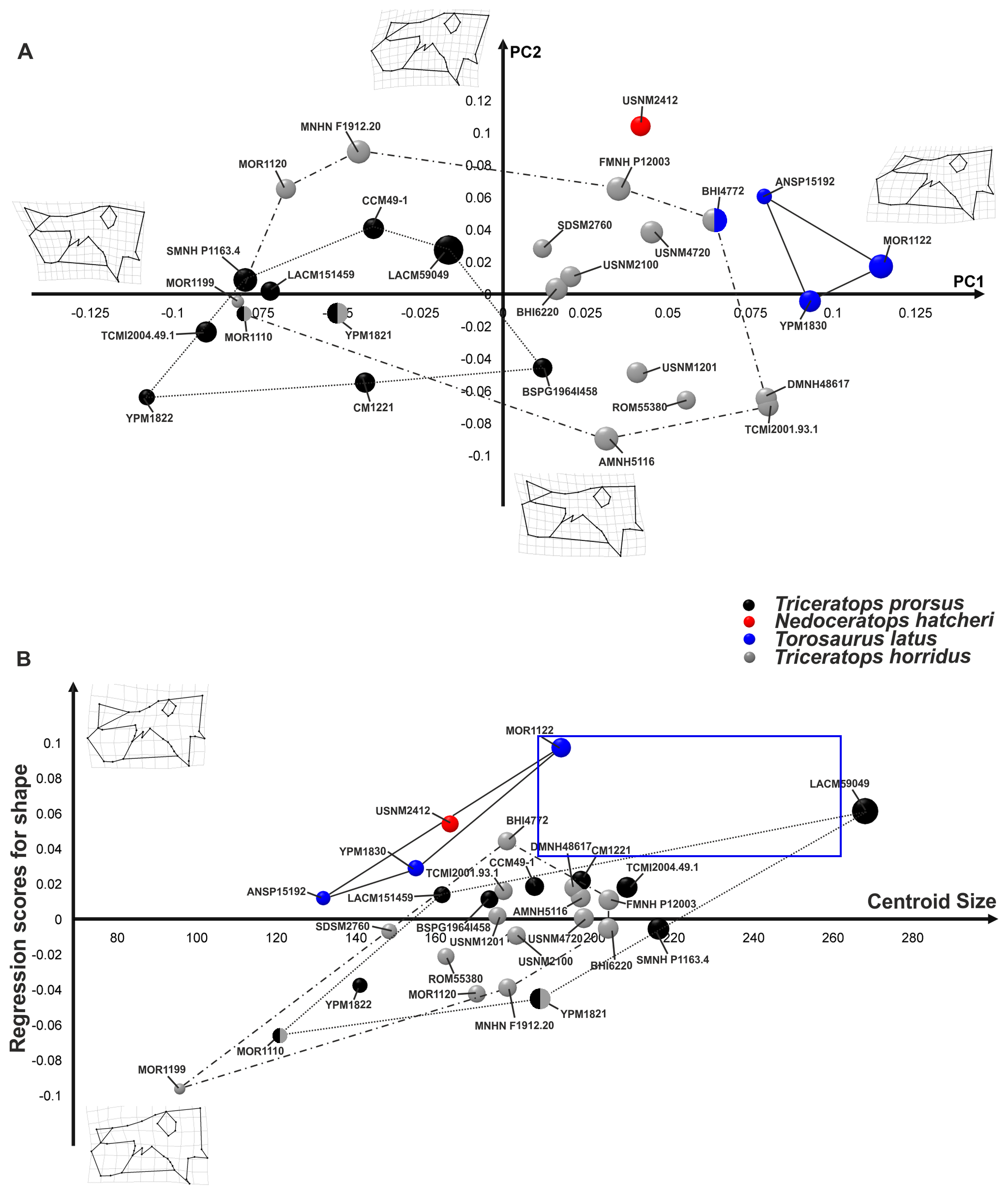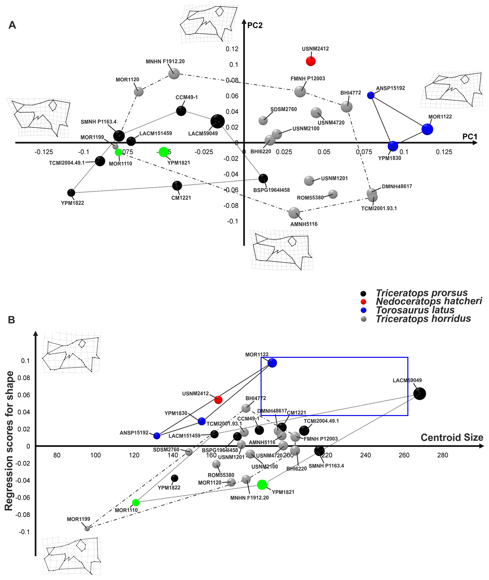 Wyniki analiz morfometrycznych Maiorino i in. (2013) (analiza głównych składowych [PCA] - czaszka bez kryzy. A: relacje między PC1 i PC2. B: zmiany morfologii w powiązaniu z rozmiarami (reprezentowanymi przez rozmiar centroida, rozmiar punktów proporcjonalny do rozmiarów centroida). Kolory punktów: niebieski: Torosaurus, szary: Triceratops horridus, czarny: Triceratops prorsus, zielony: Triceratops o niepewnej identyfikacji (zob. opis Triceratops), pomarańczowy - Nedoceratops. Niebieski prostokąt to miejsce, gdzie należałoby się spodziewać punktów Torosaurus jeśli jest synonimem Triceratops. Zmodyfikowano z Maiorino i in. (2013).