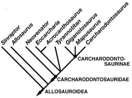 Wersja z dnia 14:53, 8 lis 2011 autorstwa Nazuul (dyskusja | edycje) (Kladogram z Sereno i Brusatte, 2008 (na podstawie Brusatte i Sereno, 2008 z usunięciem 26 nieinformatywnych dla zbadania relacji między karcharodontozaurydami cech i taksonów, usunięciem 19 kolejnych i dodaniem 6 nowych).)
