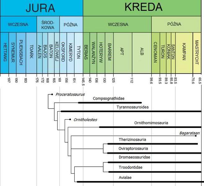 Wersja z dnia 09:31, 9 lis 2011 autorstwa Nazuul (dyskusja | edycje) (Skalibrowany stratygraficznie kladogram z Benson, 2008 (na podstawie Xu i in., 2006, z dodanymi ''Deltadromeus'', ''Eotyrannus'' i ''Stokesosaurus'' oraz odjętym ''Coelurus''). Skala czasu za Walker i Geissman, 2009.)