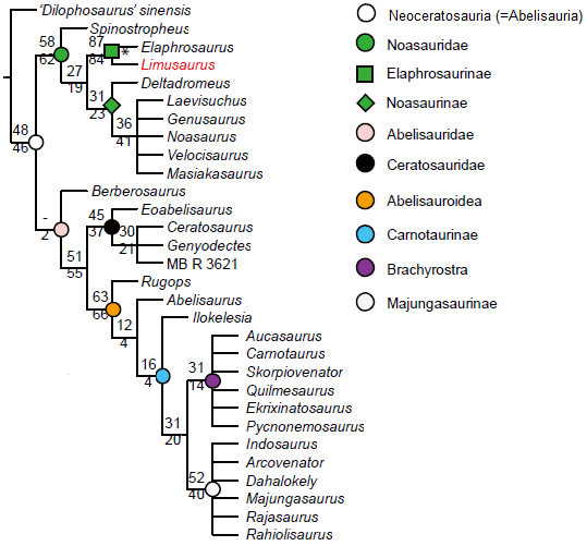 kladogram z Wang, S., Stiegler, J., Amiot, R., Wang, X., Du, G.-h., Clark, J.M. & Xu, X. (2017) "Extreme Ontogenetic Changes in a Ceratosaurian Theropod" Current Biology, 27, 1-5. doi:10.1016/j.cub.2016.10.043