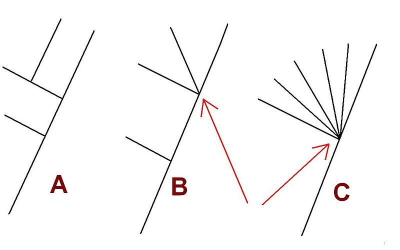 A - w pełni rozwikłaną (składającą się wyłącznie z dychotomii), B - częściowo rozwikłaną, C - "star tree" ("drzewo gwiezdne"). Politomie są zaznaczone czerwonymi strzałkami.