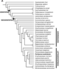Wersja z dnia 09:15, 20 mar 2025 autorstwa Paweł (dyskusja | edycje) (Kladogram (A) z Arbour i Evans, 2019 Źródło: Arbour, V., & Evans, D. C. (2019). "A new leptoceratopsid dinosaur from Maastrichtian-aged deposits of the Sustut Basin, northern British Columbia, Canada". PeerJ. doi:10.7717/peerj.7926.)