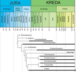 Ryc. I Skalibrowany stratygraficznie kladogram z Xu i in., 2006 - konsensus Adamsa (na podstawie matrycy Rauhuta, 2003 skupionej na bazalnych teropodach, z dodanymi Guanlong i Dilong oraz odjętym Deltadromeus). Tyrannosauroidea zawiera Stokesosaurus i ww., Compsognathidae Mirischia, a Avialae Unenlagia. Skala czasu za Walker i Geissman, 2009. W ścisłym konsensusie do politomii u podstawy Coelurosauria należało też Tyrannosauroidea.