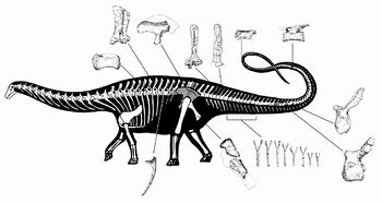 Rekonstrukcja szkieletu amazonzaura - zakreskowane odnalezione elementy. [1] | |