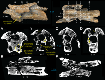 Watanabe, A., Gold, M.E.L., Brusatte, S.L., Benson, R.B., Choiniere, J., Davidson, A., Norell, M. A. (2015). "Vertebral Pneumaticity in the Ornithomimosaur Archaeornithomimus (Dinosauria: Theropoda) Revealed by Computed Tomography Imaging and Reappraisal of Axial Pneumaticity in Ornithomimosauria". PloS one, 10(12), e0145168. doi:10.1371/journal.pone.0145168.