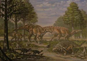 Stadko tescelozaurów w towarzystwie edmontozaurów i edmontonii. Autor: ABelov2014. [8].