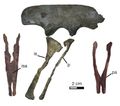 Materiał przypisany obejmuje kilka bardziej fragmentarycznych szczątków: dwie miednice (SNGM-307 i SNGM-8193), trzy trzony przednich kręgów grzbietowych (SNGM-1894, SNGM-1898 i SNGM-1903), trzon tylnego kręgu grzbietowego (SNGM-1898), niekompletną k. biodrową (SNGM-1889), bliższą część k. piszczelowej (SNGM-1895), dalszą część k. piszczelowej (SNGM-1901), trzy k. śródstopia (drugą, trzecią oraz częściową czwartą - SNGM-1890), częściową dłoń (dalszą część pierwszej k. nadgarstka, trzy k. śródręcza [pierwsza, niekompletna druga i trzecia], bliższa część pierwszego paliczka pierwszego palca, drugi paliczek drugiego palca oraz ?drugi i ?trzeci paliczek trzeciego palca - SNGM-1887) oraz dalsza część kończyny tylnej (dalsza część k. piszczelowej, dalsza część k. strzałkowej, k. skokowa, k. piętowa, dalsza część czwartej k. stępu, druga, trzecia i czwarta k. śródstopia, pierwszy i drugi paliczek drugiego palca, bliższa część pierwszego paliczka trzeciego palca, bliższa część pierwszego paliczka czwartego palca oraz niekompletny paliczek pazura - SNGM-1887).