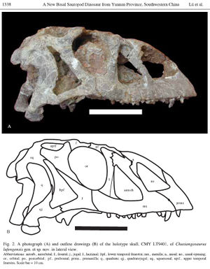 3. 3,0 3,1 Wang, Y.-M., You, H.-L., Wang, T. 2017. A new basal sauropodiform dinosaur from the Lower Jurassic of Yunnan Province, China. Scientific Reports, t. 7, nr art. 41881. [3]