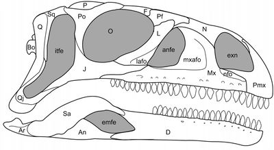 Czaszka koloradizaura w widoku od góry. Skala 2 cm. Wybrane objaśnienia: F - czołowa, Mx - szczękowa, N - nosowa, stfe - górne okno skroniowe. Źródło: Apaldetti i in., 2014.