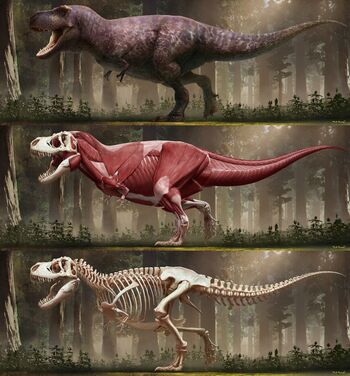 Rekonstrukcja szkieletu, mięśni oraz przyżyciowa Tyrannosaurus rex. Autor: RJ Palmer (arvalis). Źródło: [29]