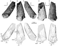 CMN 9955 - dwa zniszczone elementy kręgów, niewypreparowana kość udowa [8] CMN 9954 - kość śródstopia III [8] TMP 2011.053.0150 - korona zęba [11] fragment zęba [8] kość nadgarstka lub stępu [8] |