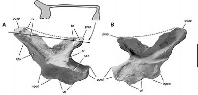 Prawa kość biodrowa ignotozaura (holotyp) widoczna z boku (A) i od | |