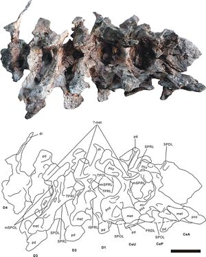 Holotyp o numerze katalogowym NHMG 034062 stanowi siedem artykułowanych kręgów, w tym trzy tylne szyjne i pierwsze cztery grzbietowe, artykułowane dwa żebra szyjne i trzy żebra grzbietowe. Okaz jest przechowywany w Muzeum Historii Naturalnej Autonomicznego Regionu Guangxi Zhuang.