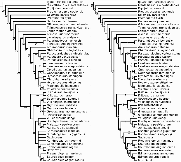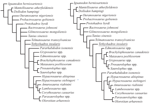 Kladogramy z Dalla Vecchia, 2009 (na podstawie Prieto-Marquez i in., 2006A z dodanym Tethyshadros, 7 nowymi cechami i wieloma zmianami). Na lewo ścisły konsnesus, na prawo 50 majority rule.