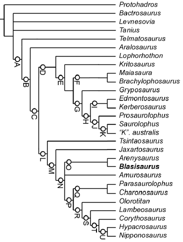 Cruzado-Caballero, P., Pereda-Suberbiola, X. & Ruiz-Omenaca, J.I. (2010) "Blasisaurus canudoi gen. et sp. nov., a new lambeosaurine dinosaur (Hadrosauridae) from the Latest Cretaceous of Aren (Huesca, Spain)" Canadian Journal of Earth Sciences, 47, 1507-1517.