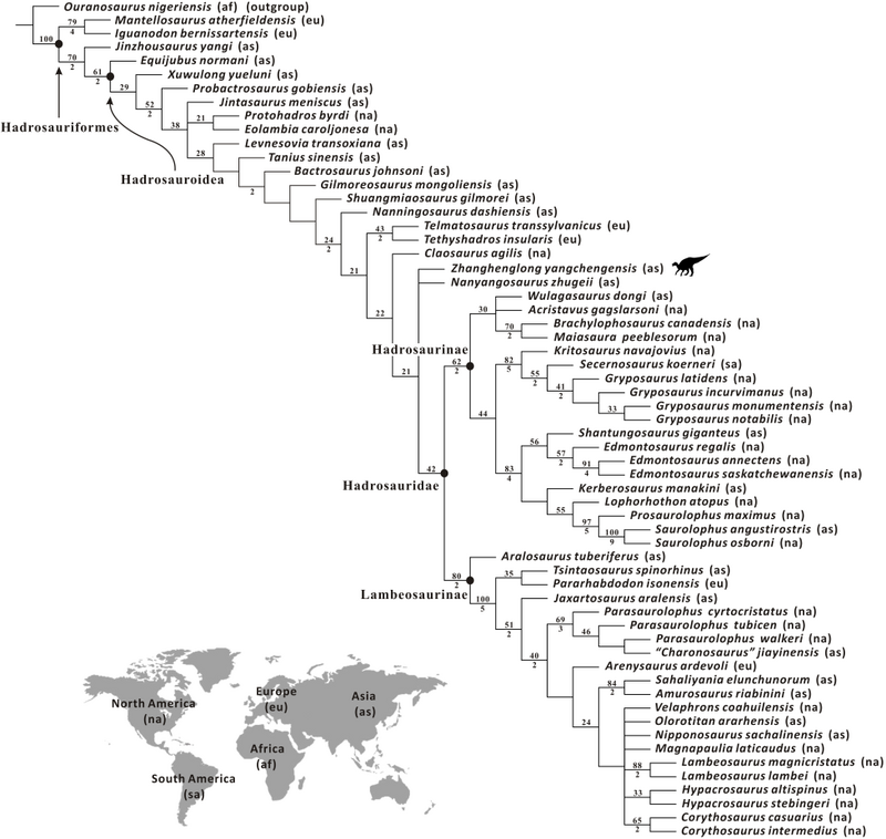 Xing, H., Prieto-Marquez, A., Gu, W. & Yu, T.-X. (2012) "Re-evaluation and phylogenetic analysis of Wulangasaurus dongi, a hadrosaurine dinosaur from the Maastrichtian of northeast China" Vertebrata PalAsiatica, 50(2), 160-169.