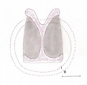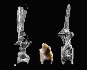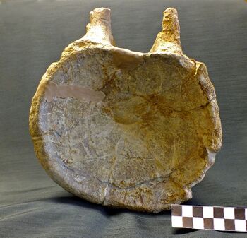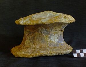 Holotyp (JP Cr376) - trzon kręgu grzbietowego, widziany od strony ogonowej. Autor zdjęcia: Tomasz Singer. | |