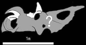 Materiał kopalny: niekompletna czaszka zawierająca obejmującą róg nosowy, kość oczodołową, kwadratową, kłykieć potyliczny oraz kość szczękową
