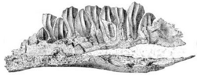 Kość ta uległa uszkodzeniu podczas preparacji i nie została wydobyta ze skały wapiennej, w której tkwiła. Wystawiona na ekspozycje była jej przyśrodkowa (medial) część. Dopiero w 1975 roku (aż 101 lat po jej naukowym opisaniu!) została wydobyta za pomocą kwasu octowego, który rozpuścił wapień. Całkowicie odsłonięta prawa kość zębowa jest poprzecznie zgnieciona, lecz w 100% wydobyta ujawniła 15 zachowanych zębodołów (w tym jeden szczątkowy) z większością zębów i wyrostek dziobasty.