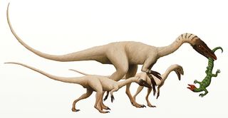 Celofyzy zjadające drepanozaura. Autor Edyta Felcyn.