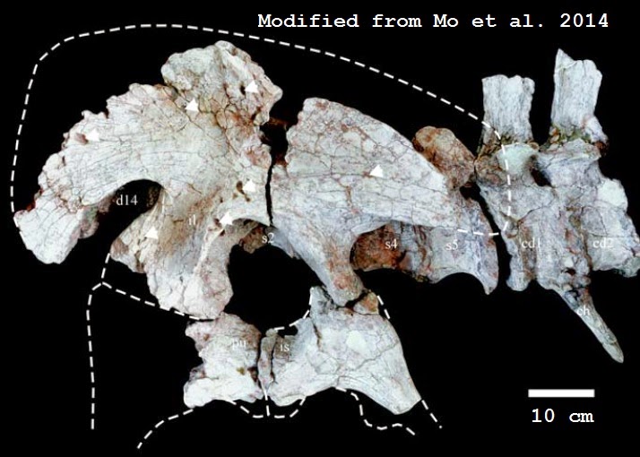 Szczątki datanglonga. Źródło: Cau, 2014 online, modyfikacja z Mo i in. (2014) http://theropoda.blogspot.com/2014/08/datanglong-un-nuovo-carcharodontosauria.html