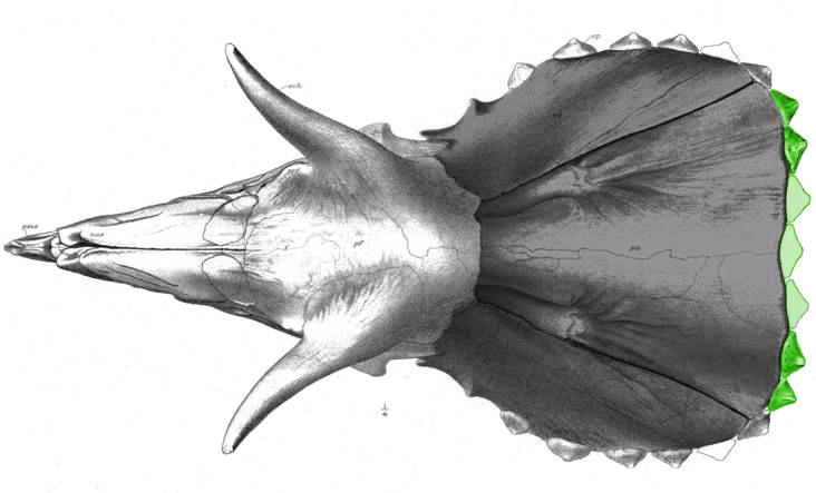 Czaszka Triceratops w widoku z góry. Na zielono zaznaczono episquamosals, zaś na czerwono - epiparietals" (rysunek pochodzi z http://www.johnscannella.com/Triceratops.php - zmodyfikowane z Hatcher i in., 1907).