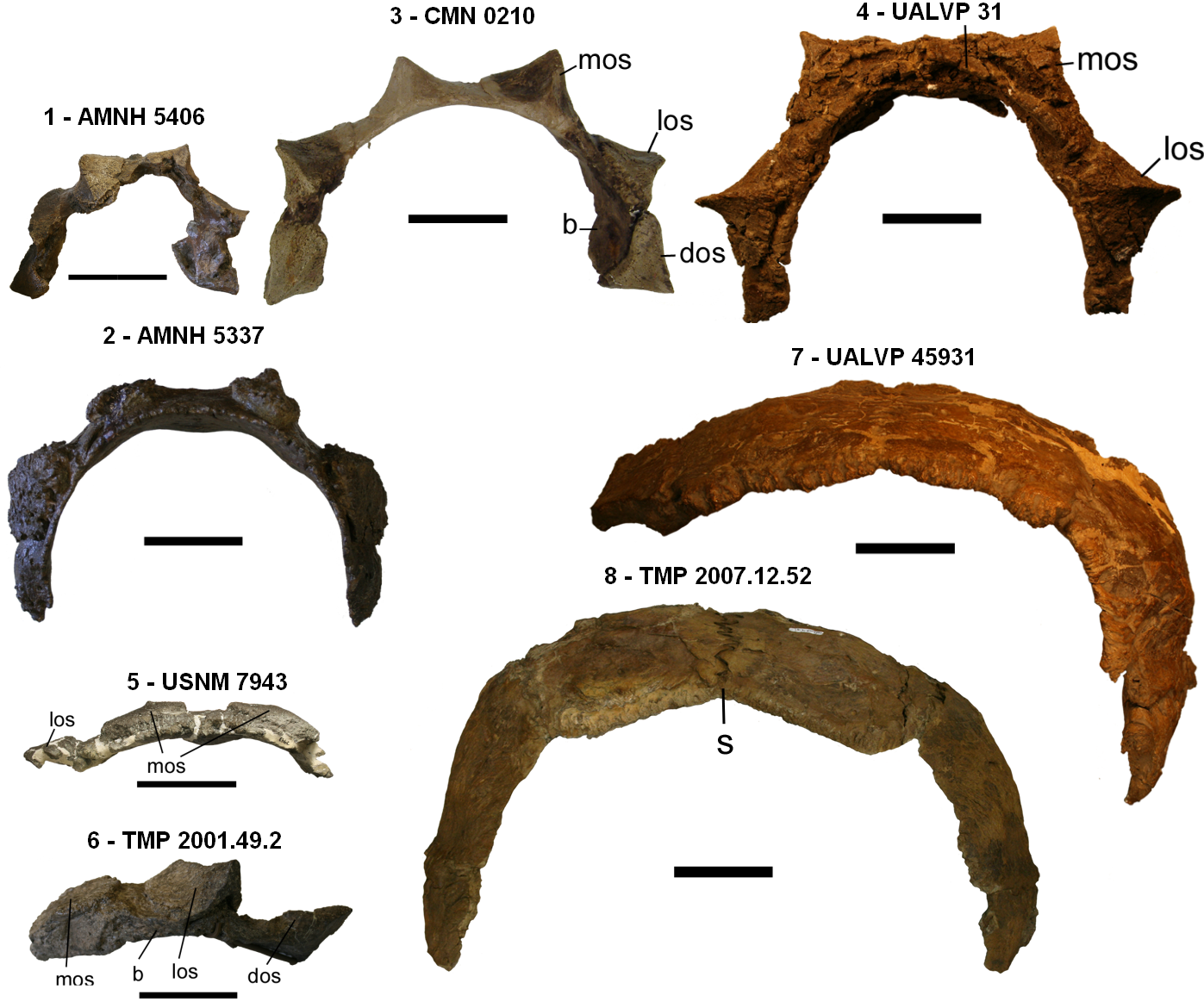 Pierwsze pierścienie szyjne u Ankylosauridae: 1-4 - Euoplocephalus tatus; choć pierścienie 2-4 są zbliżone obwodem i średnicą, Arbour i Currie (2013) podają, że osobnik 2 (z dość spłaszczonymi osteodermami i dłuższym pierścieniem) jest znacznie większy i masywniejszy niż osobniki 1, 3 i 4 (por. też ryc. 11 A, B i D w ww. pracy), sam pierścień jest też dłuższy u osobnika 3. 5 - Scolosaurus, 6 - nieoznaczony. Drugie pierścienie szyjne: 7-8 - Ankylosauridae indet.. Skala = 10 cm. Źródło: Arbour i Currie, 2013.
