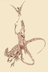 Celofyzoidy próbują upolować wczesnego pterozaura. Autor: Jakub Kowalski.