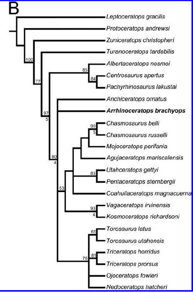 Mallon, J. C., Holmes, R., Anderson, J. S., Farke, A. A., & Evans, D. C. (2014). "New information on the rare horned dinosaur Arrhinoceratops brachyops (Ornithischia: Ceratopsidae) from the Upper Cretaceous of Alberta, Canada". Canadian Journal of Earth Sciences, 51(6), 618-634. doi:10.1139/cjes-2014-0028
