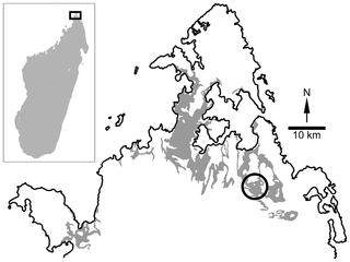 Mapa północnej części Madagaskaru z zaznaczonym miejscem znalezienia holotypu Dahalokely. Źródło: Farke i Sertich, 2013. doi:10.1371/journal.pone.0062047 Licencja: Creative Commons Attribution License.