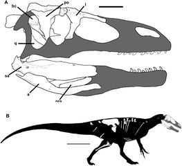 Rekonstrukcja szkieletu Murusraptor. Na biało odnalezione kości. Źródło: Coria i Currie, 2016. http://journals.plos.org/plosone/article?id=10.1371/journal.pone.0157973 Licencja: Creative Commons Attribution 4.0 International https://creativecommons.org/licenses/by/4.0/