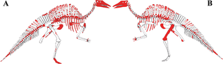Szkielet osobnika MSNVE 3714 (na czerwono zrekonstruowane kości). Źródło: Bertozzo, F., Dalla Vecchia, F.M., Fabbri, M. (2017) “The Venice specimen of Ouranosaurus nigeriensis (Dinosauria, Ornithopoda).” PeerJ 5:e3403. https://peerj.com/articles/3403/. Licencja: Creative Commons CC-BY 4.0