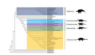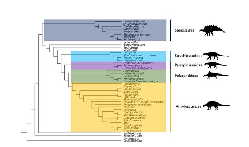 Kladogram z Raven i in., 2023. Raven, T. J., Barrett, P. M., Joyce, C. B., & Maidment, S. C. R. (2023). The phylogenetic relationships and evolutionary history of the armoured dinosaurs (Ornithischia: Thyreophora). Journal of Systematic Palaeontology, 21(1). https://doi.org/10.1080/14772019.2023.2205433