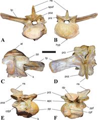 NHMUK PV R 16435, przedni kręg grzbietowy (3) Sigilmassasaurus brevicollis. (A) widok z tyłu, (B) widok z przodu, (C) widok z dołu, (D) widok z góry, (E) widok z prawej strony, (F) widok z lewej strony. Źródło: Evers, Rauhut, Milner, McFeeters and Allain, 2015. A reappraisal of the morphology and systematic position of the theropod dinosaur Sigilmassasaurus from the "middle" Cretaceous of Morocco. PeerJ. 3:e133. doi: 10.7717/peerj.1323 (poprawiono identyfikację widoków). Licencja: Distributed under Creative Commons CC-BY 4.0 https://creativecommons.org/licenses/by/4.0/