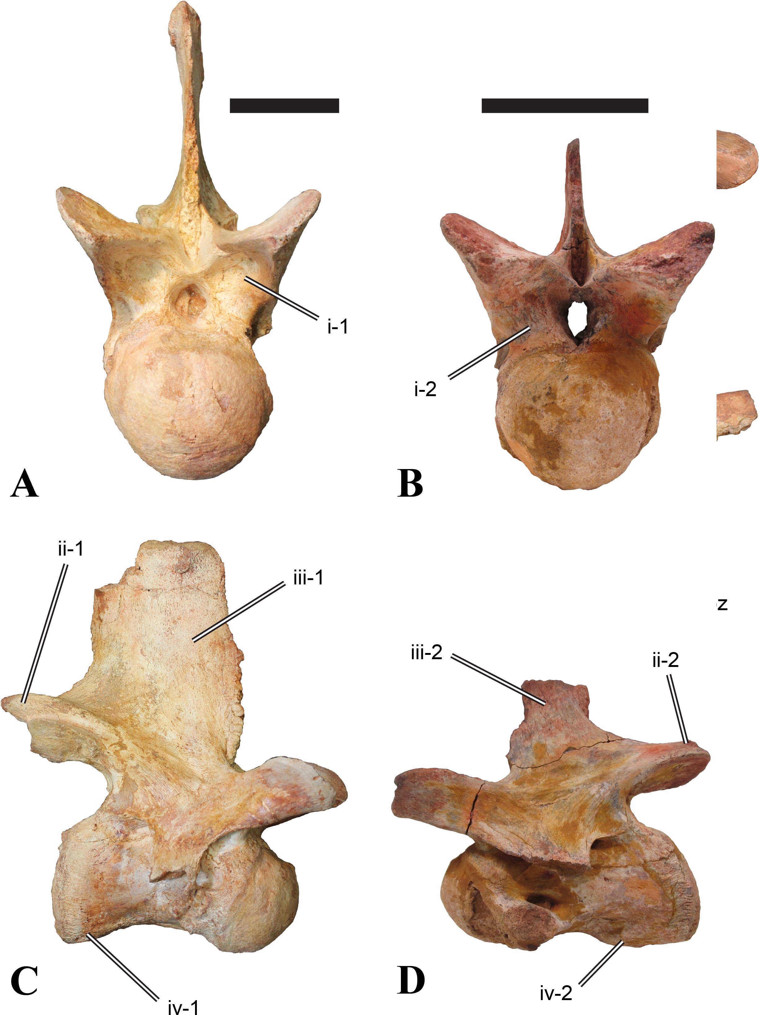 Porównanie różnic w budowie kręgów szyjnych spinozaurydów z Kem Kem. Widoki (A) i (C): BSPG 2006 I 57, widoki (B) i (D): nieoznaczony spinozauryd. Źródło: Evers, Rauhut, Milner, McFeeters and Allain, 2015. A reappraisal of the morphology and systematic position of the theropod dinosaur Sigilmassasaurus from the "middle" Cretaceous of Morocco. PeerJ. 3:e133. doi: 10.7717/peerj.1323 (poprawiono identyfikację widoków). Licencja: Distributed under Creative Commons CC-BY 4.0 https://creativecommons.org/licenses/by/4.0/