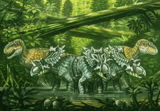 Grupa Spiclypeus otoczona przez parę Daspletosaurus.